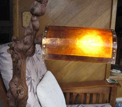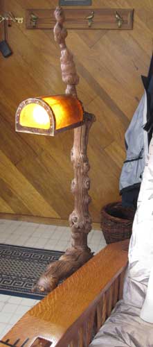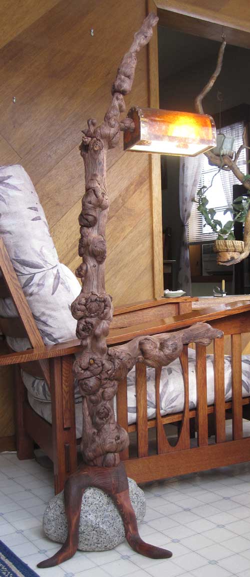 The lamp features a mica shade and the appearance of roots flowing over a granite boulder. The roots are actually made of scrap wood and 2x4s sculpted into shape. The lamp still needs a coat of varnish. The on/off switch is hidden on the underside of the protruding branch.