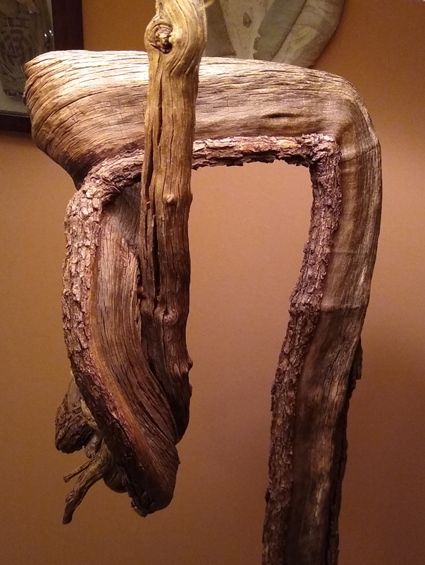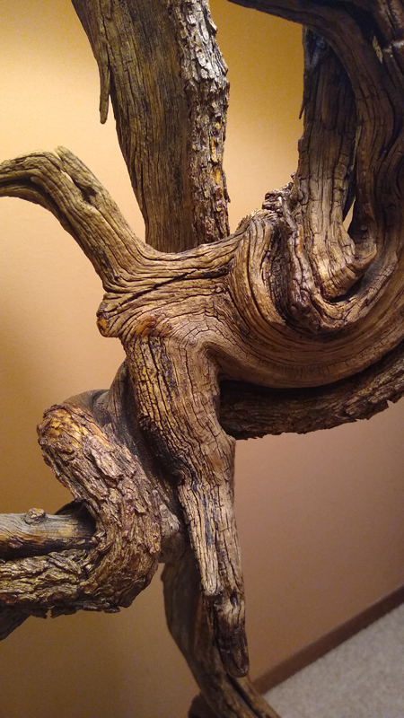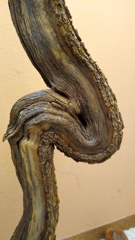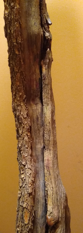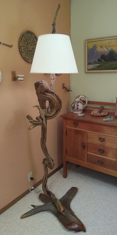 This spectacular lamp stands 7 feet tall from floor to finial. It is made from one twisty hardwood stem from Utah, mounted on a footing of Utah juniper. The power wire is ingenioiusly hidden within the twisting stem from bottom to bulb. The lamp features a three-way LED bulb. All cuts have been rounded and sanded to furniture grade. All surfaces have been rotary sanded with abrasive bristles to remove anything loose or rough. The finished lamp was first oiled, then sprayed with multiple coats of semi-gloss polyurethane.
