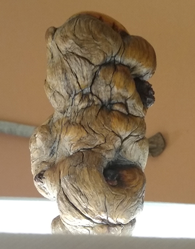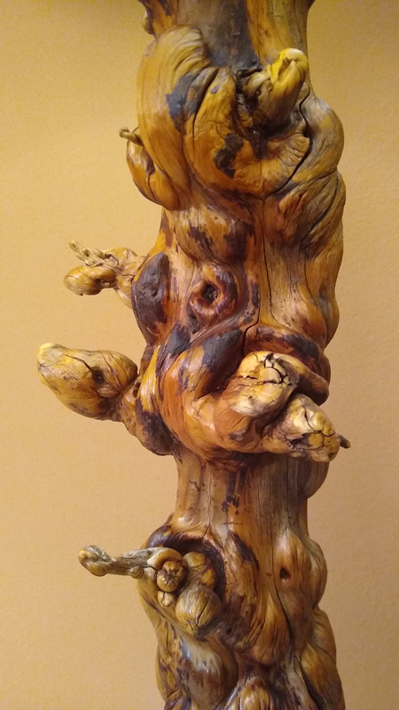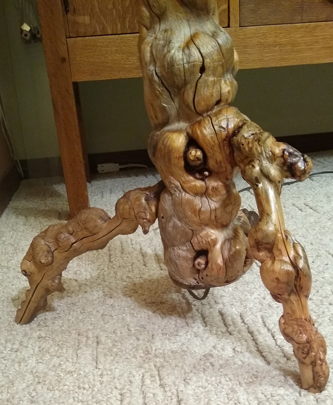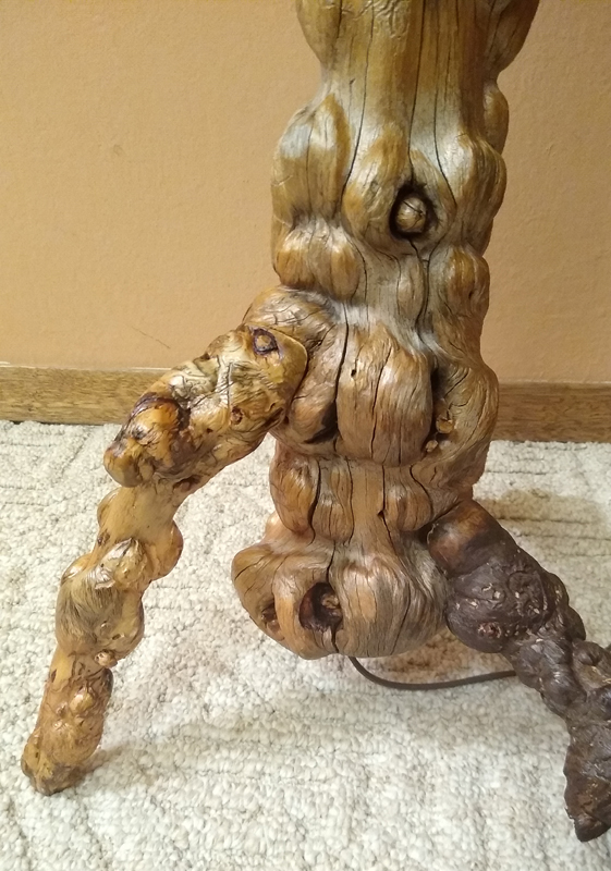 This showpiece lamp stands 6 feet tall from floor to finial. It is made from one piece of straight burlwood from the mountains of Oregon, with burlwood legs added. The lamp features a three-way LED bulb. All cuts have been rounded and sanded to furniture grade. All surfaces have been rotary sanded with abrasive bristles to remove anything loose or rough. The finished lamp was first oiled, then sprayed with multiple coats of semi-gloss polyurethane.