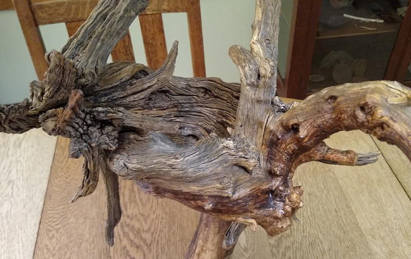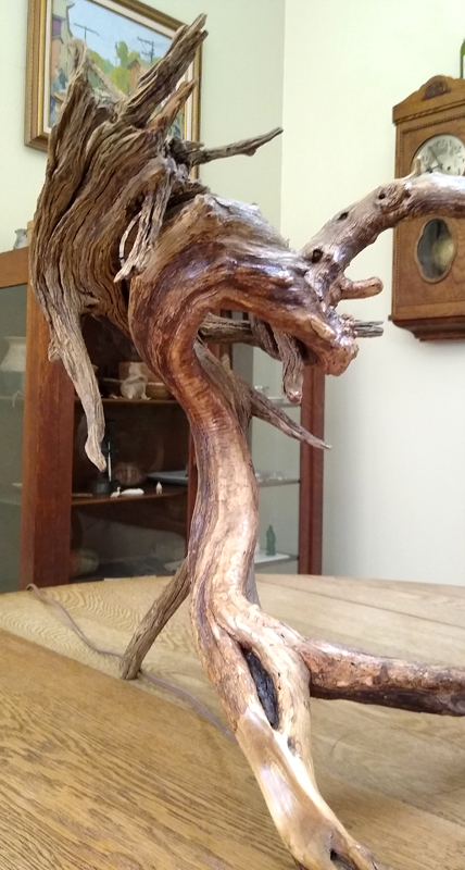 This lamp is a challenging one to comprehend unless you are looking at it in person. It twists and winds its way skyward, and stands 33" tall from tabletop to the top of the shade. Composed of a single stem of desert shrub, the power cord is hidden through the 360 degree rotation of the stem in two axes. The lamp features a three-way LED bulb. All cuts have been rounded and sanded to furniture grade. All surfaces have been rotary sanded with abrasive bristles to remove anything loose or rough. The finished lamp was first oiled, then sprayed with multiple coats of semi-gloss polyurethane.