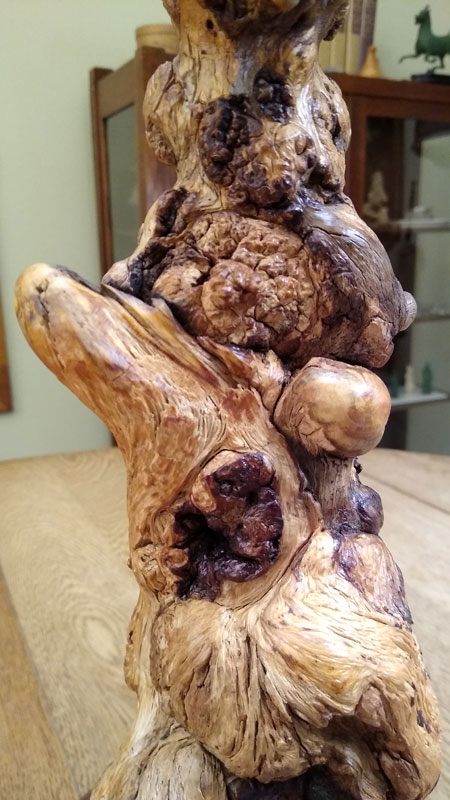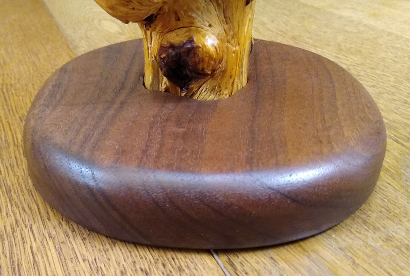 This tabletop lamp stands 28" tall and the stem is inset into a scultped base of black walnut. The power cord exits the base in the rear, centered vertically on the thickness of the base. All cuts have been rounded and sanded to furniture grade. All surfaces have been rotary sanded with abrasive bristles to remove anything loose or rough. The finished lamp was first oiled, then sprayed with multiple coats of semi-gloss polyurethane.