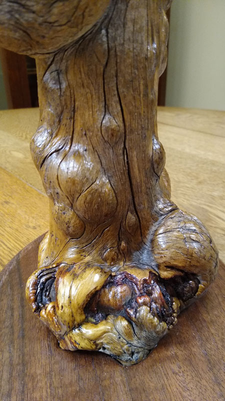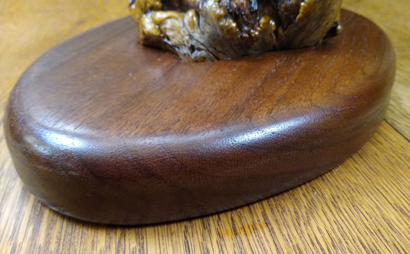 This tabletop lamp stands 30" tall and the stem (2-2.5" diameter) is inset into a scultped base of black walnut. The power cord exits the base in the rear, centered vertically on the thickness of the base. All cuts have been rounded and sanded to furniture grade. All surfaces have been rotary sanded with abrasive bristles to remove anything loose or rough. The finished lamp was first oiled, then sprayed with multiple coats of semi-gloss polyurethane.