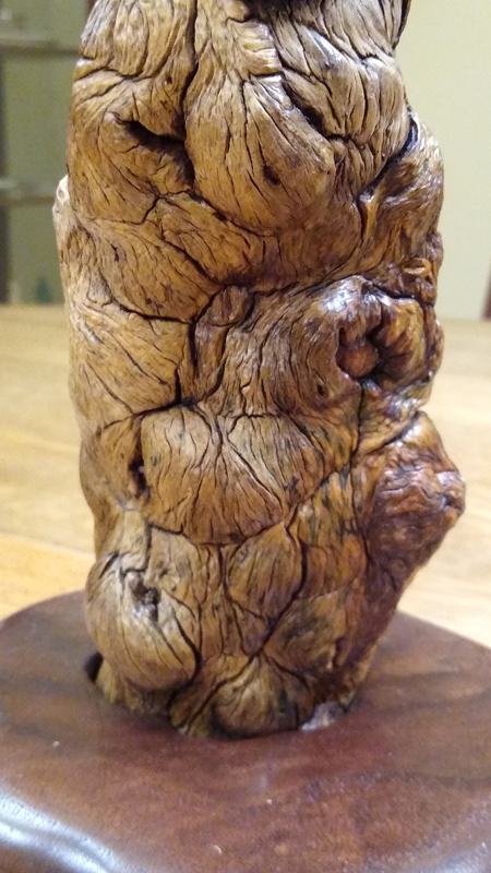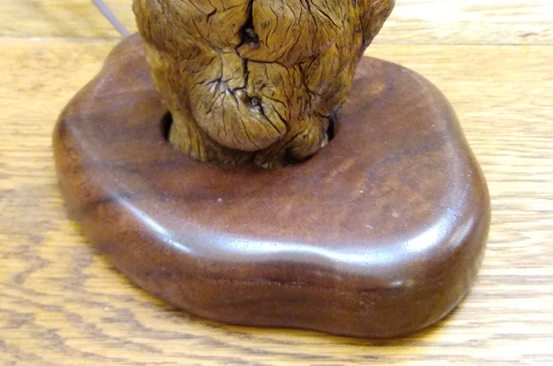 This tabletop lamp stands 26.5" tall and is the most petite of the burlwood lamps. The stem is inset into a rounded base of black walnut. The power cord exits the base in the rear, centered vertically on the thickness of the base. The lamp features a three-way LED bulb. All cuts have been rounded and sanded to furniture grade. All surfaces have been rotary sanded with abrasive bristles to remove anything loose or rough. The finished lamp was first oiled, then sprayed with multiple coats of semi-gloss polyurethane.